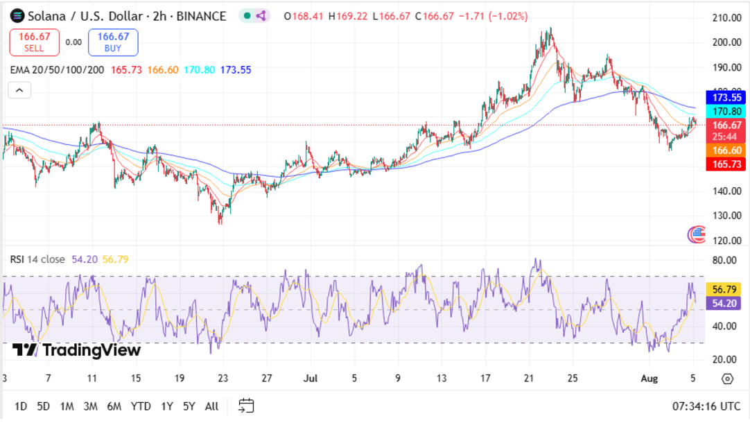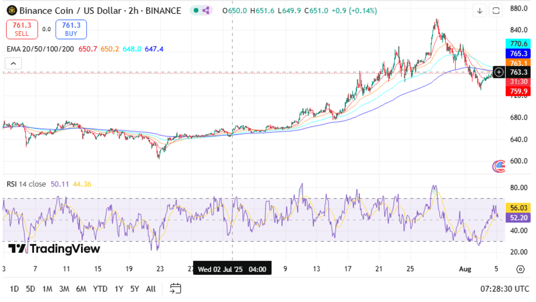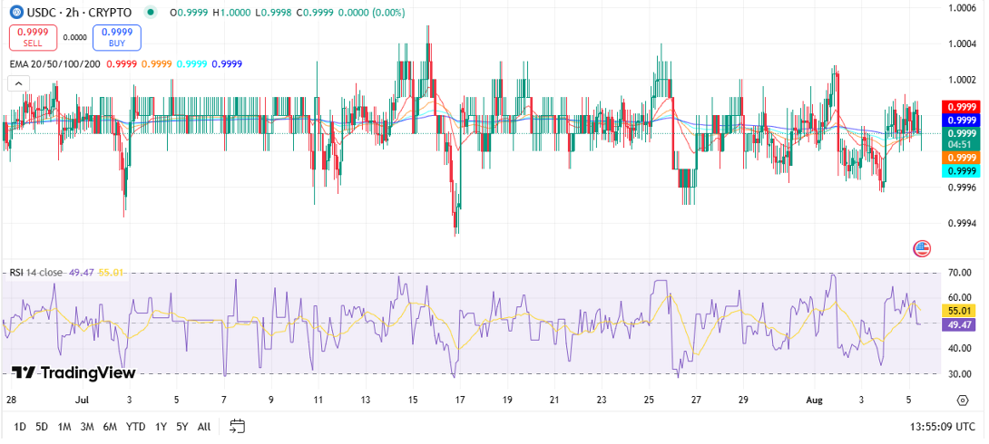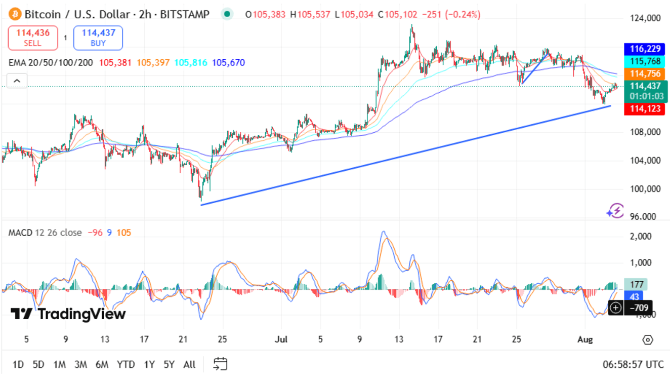• According to the 2-hour chart, Bitcoin is very close to $114,150, and it is trading below the 20, 50, and 100 EMA levels; however, it is still above the 200 EMA by a very small margin ($114,154). The price is also following the ascending trendline from the end of June, which means the bigger uptrend is still there if this line is not broken.