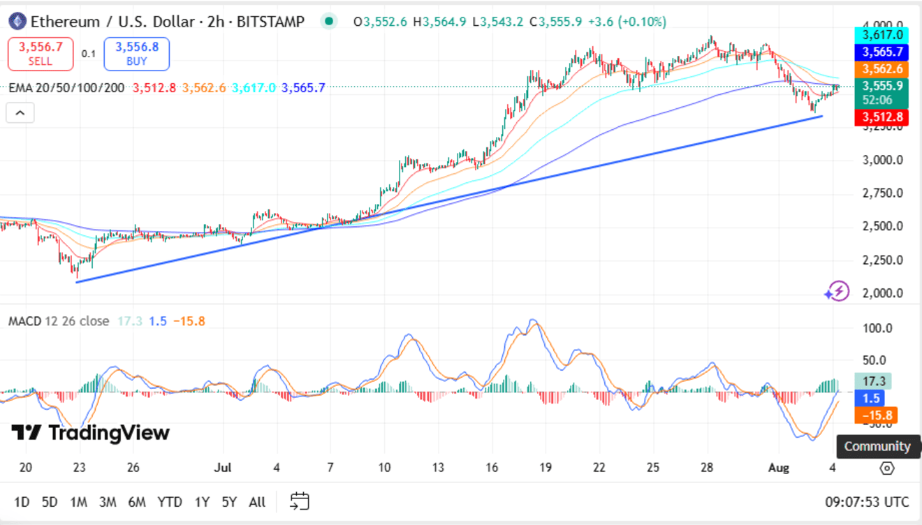 • On the 2-hour chart of Ethereum, it is evident that the price is above the 20 ($3,613), 50 ($3,597), 100 ($3,625), and 200 ($3,575) EMAs. Apart from that, ETH is still in the bullish territory since it is going to be above the ascending trendline and the 200 EMA support area, despite a slight pullback.