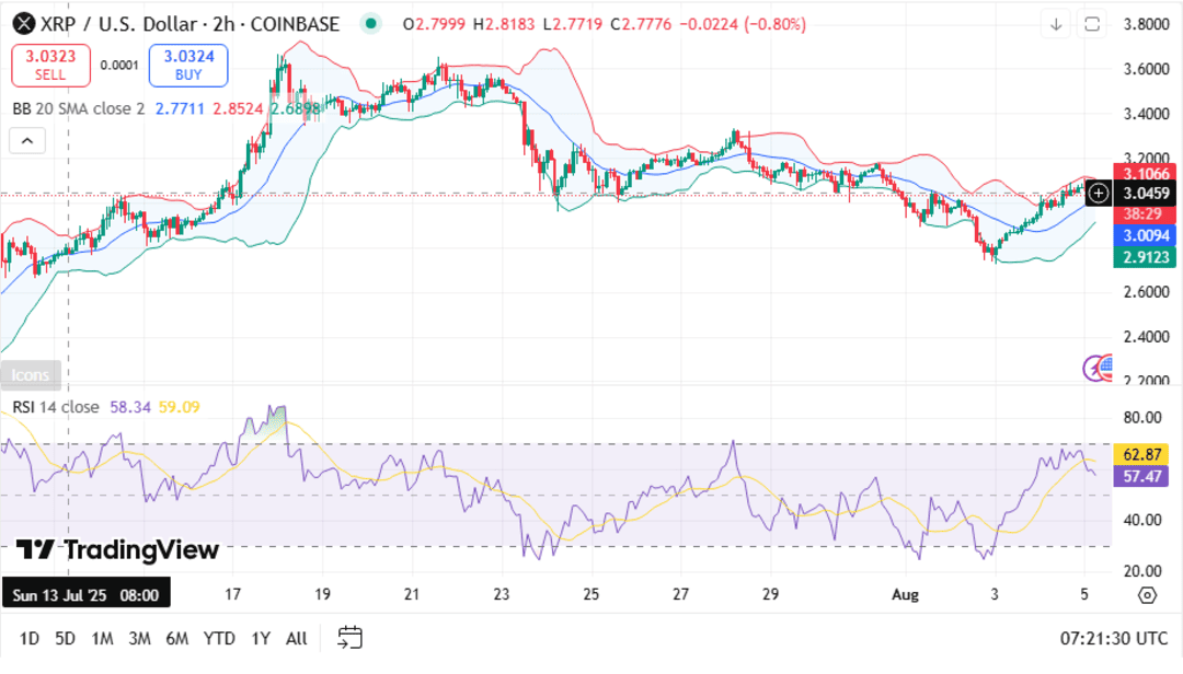 • XRP is trading around $2.78, slightly above the middle Bollinger Band ($2.77), which means it is experiencing mild bullish strength but still encountering selling pressure near the upper band at $3.10.