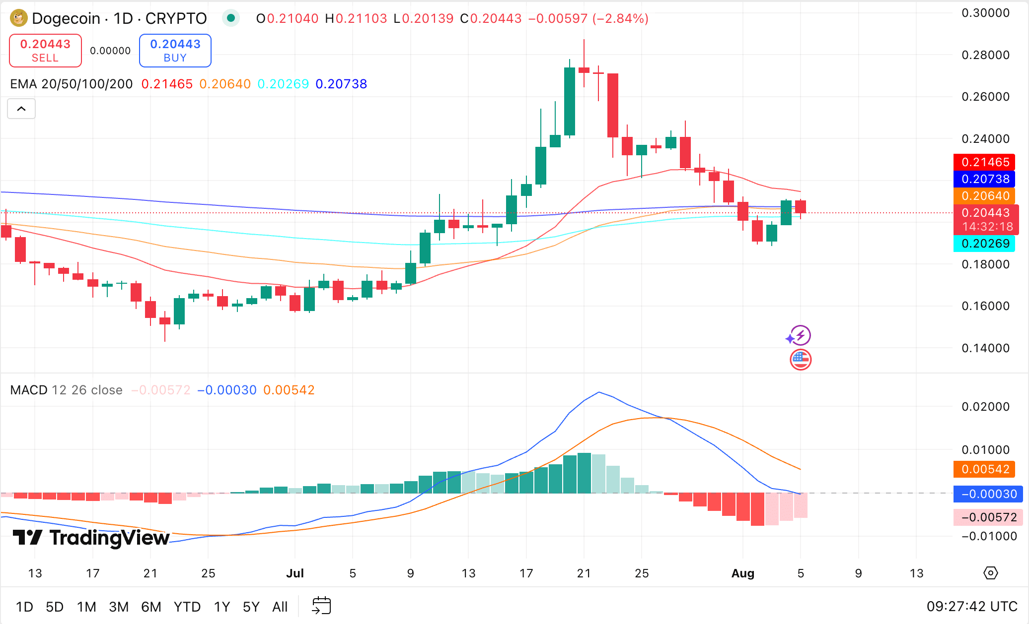 • Dogecoin is trading near $0.2030, below its 20-day ($0.2039), 50-day ($0.2050), 100-day ($0.2111), and 200-day ($0.2167) EMAs, indicating a short-term bearish bias despite a recent bounce.