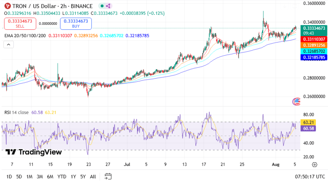 • TRX holds above key support levels, trading near $0.311, and remains comfortably above the 20-day EMA ($0.33) and 50-day EMA ($0.32), showing short-term bullish structure.
