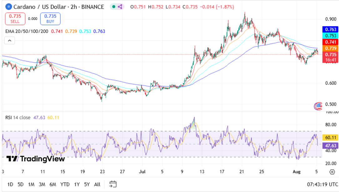 • Cardano is trading near $0.735, just below the 20-day ($0.741), 50-day ($0.739), and 100-day ($0.753) EMAs, indicating a cautious recovery attempt after a recent downtrend.